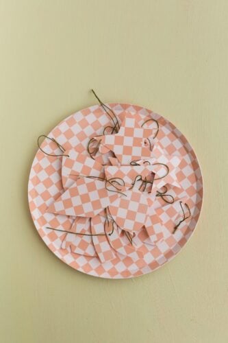 I found the checkered plates for Hayes’ birthday party online: shop checkered paper plates. And they were perfect for his bday (and also so cute for this DIY). But there are tons of other cool patterned plate designs that would be perfect for this project.