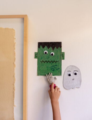 This DIY Halloween project appears in Halloween: 31 Crafty Days of Halloween for Kids, a free eBook available for download now. It features 31 kid-friendly DIY ideas for spooky season. Including clay bowls, a monster piggy bank, cute and spooky art made with junk mail, and so much more.