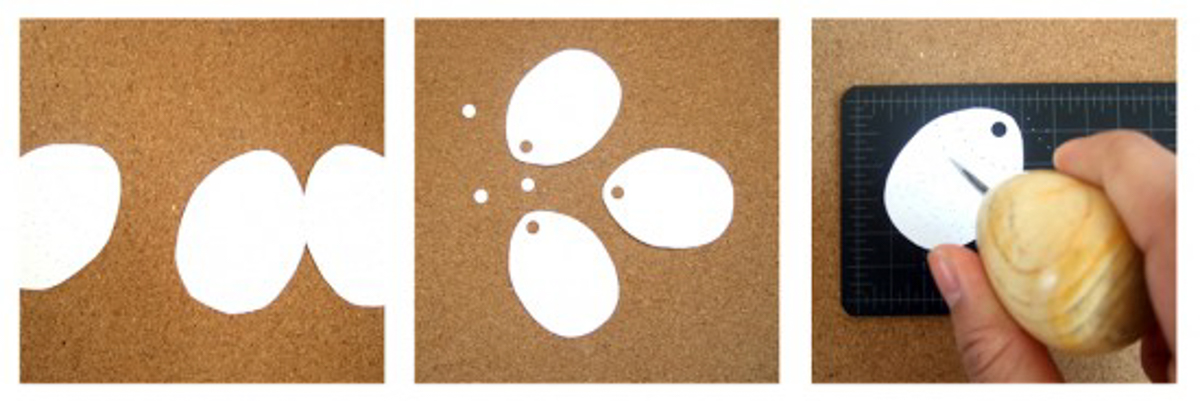Prepare the tags for sewing by printing the template onto card stock and cutting out the eggs. Use your scissors or a hole punch to make holes for the ribbon where marked on the template. Then, use your pointy object to poke holes through every dot on each egg. This makes it much easier to sew through the paper without tearing and keeps everything nice and neat.