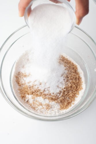 - In a large bowl, sift together the flour, baking powder, baking soda, salt, cinnamon, and nutmeg. Continue by adding the sugar and mix until combined.