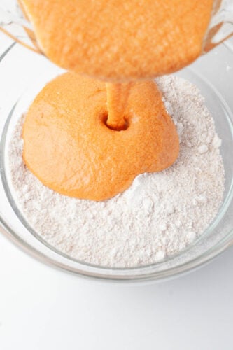 - Add the pumpkin mixture into the dry ingredients. Scrape down the sides as needed and mix until combined.