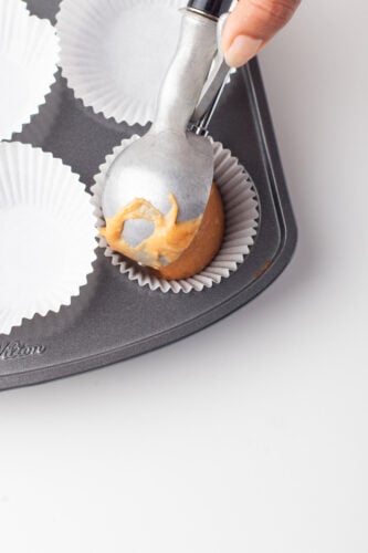 - Fill the paper liners three quarters full, using an ice cream scooper.