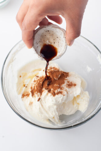 2. Beat in the vanilla and cinnamon. Mix until combined.