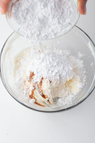 - Add in the powdered sugar gradually, and manually mix until combined.