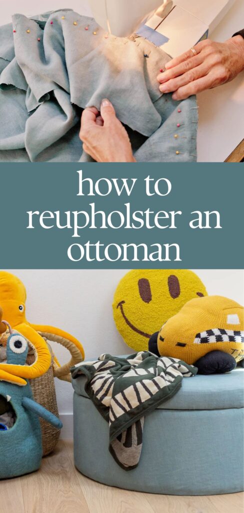 I’ve had this white boucle storage ottoman for a few years now. And over time, it had become pretty dirty. Having a kid and a dog will do that. So when I moved it into my son’s room, so he would have more toy storage and a place to sit, I thought I’d freshen it up and reupholster it.