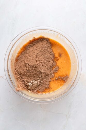 Next, stir in cocoa powder, oat flour, baking soda, and salt.